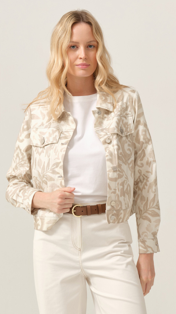 Krátký, lehce boxy střih do pasu krásně zvýrazní siluetu a perfektně ladí s kalhotami i sukněmi s vyšším pasem. Jemný tón v přírodních béžových odstínech doplňuje výrazný, ale stále elegantní vzor, který dodává modelu originalitu a šmrnc.
