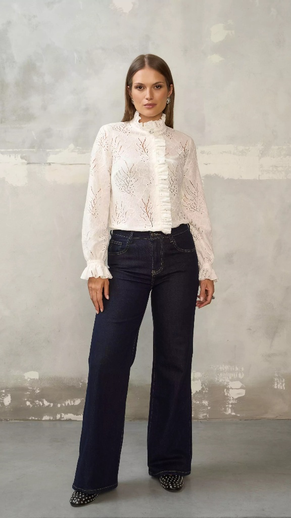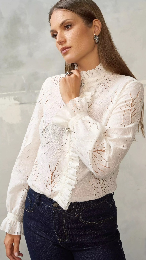 Ženská, decentní a plná charakteru. Tato halenka dodá každému outfitu jedinečný nádech – ať už ji zkombinujete s džínami nebo elegantními kalhotami. Je nádherná a neuvěřitelně všestranná. Jemná krajka vytváří složitý vzor a dodává jemnou smyslnost. Volány na stojáčku a manžetách dodávají outfitu romantický nádech a jemně zdůrazňují ruce. Perlové knoflíky a ozdoby připomínající drahokamy dodávají třpyt a vytvářejí luxusní detail. Jednoduchý střih zachovává eleganci a umožňuje různé outfity – od každodenního nošení až po zvláštní příležitosti. Vysoce kvalitní látka krásně splývá a zajišťuje pohodlí.