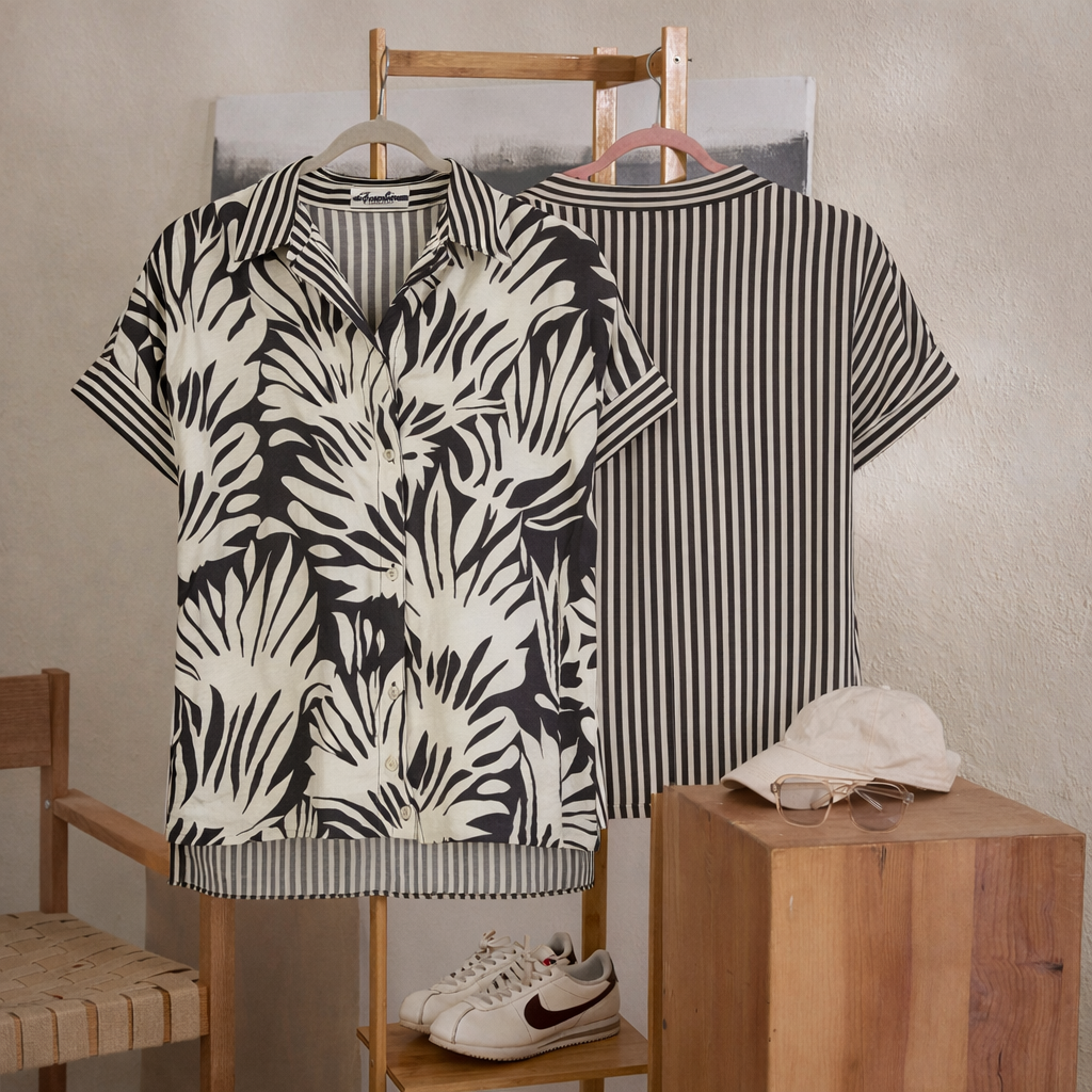 Stylová oversize košile, která zaujme originální kombinací vzorů a nadčasovou černo-smetanovou barevností. Přední díl zdobí výrazný rostlinný motiv, zatímco zadní strana a vnitřní detaily jsou řešeny jemným proužkem, který celému modelu dodává moderní kontrast a lehkost.