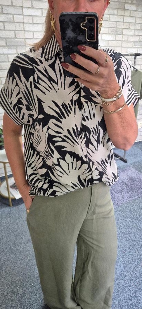 Košile má volnější oversize střih, který krásně splývá, je pohodlný na nošení a lichotí postavě. Krátké rukávy s ohrnutím a klasický límeček působí elegantně, zapínání na knoflíčky umožňuje nosit košili jak formálně, tak i ležérně rozepnutou.