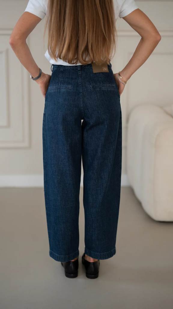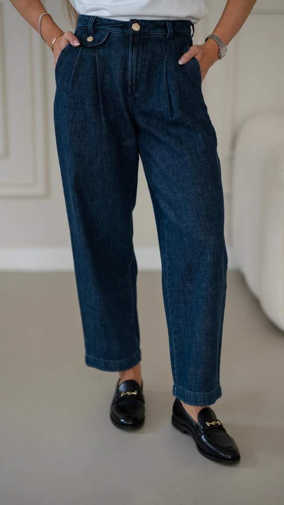 Na předním díle jsou záševky, které krásně tvarují látku a zvýrazňují pas. Tvarované stříbrné knoflíky spolu s tmavě modrou povrchovou úpravou dodávají džínům elegantní a sofistikovaný vzhled.