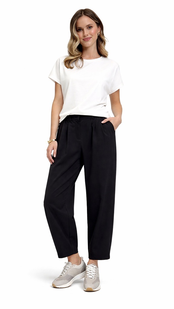 Elegantní kalhoty s elastickým pasem a s mírně balonovým střihem nohavic, které dodávají outfitu moderní a uvolněný vzhled. Elastický pas zajišťuje maximální pohodlí po celý den.. Vyrobené z pružného materiálu, který krásně drží tvar a vyhlazuje siluetu. Postranní kapsy na zip, efektní detaily a promyšlený střih podtrhnou jejich moderní vzhled.