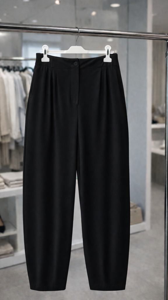 Kalhoty mají typický barelový tvar – volnější přes stehna, lehce zúžené ke kotníkům, což krásně formuje siluetu a zároveň poskytuje maximální komfort při nošení.