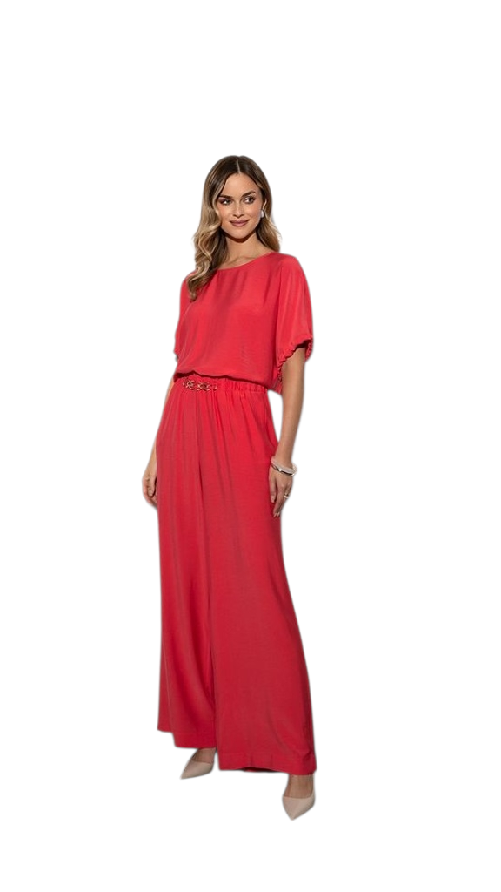 Kalhoty mají volný, lehce rozšířený střih, který opticky prodlužuje nohy a působí velmi žensky. Materiál je jemný, splývavý a příjemný na nošení. V kombinaci s halenkou DIXI ze stejné kolekce tvoří dokonale sladěný komplet ve stylu moderního overalu – ideální pro společenské příležitosti, pracovní schůzky i elegantní večerní outfit.