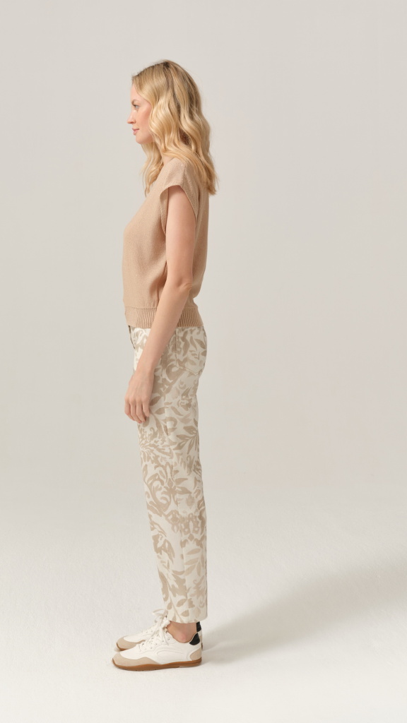Kalhoty FERIA zaujmou na první pohled svým originálním tón v tónu vzorem v přírodních béžových odstínech, který působí velmi sofistikovaně a nadčasově. Díky tomu je snadno zkombinujete nejen jako komplet s bundičkou, ale i samostatně s jednoduchými topy či úplety.