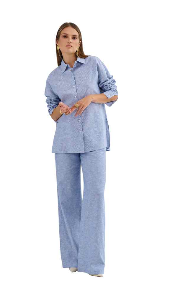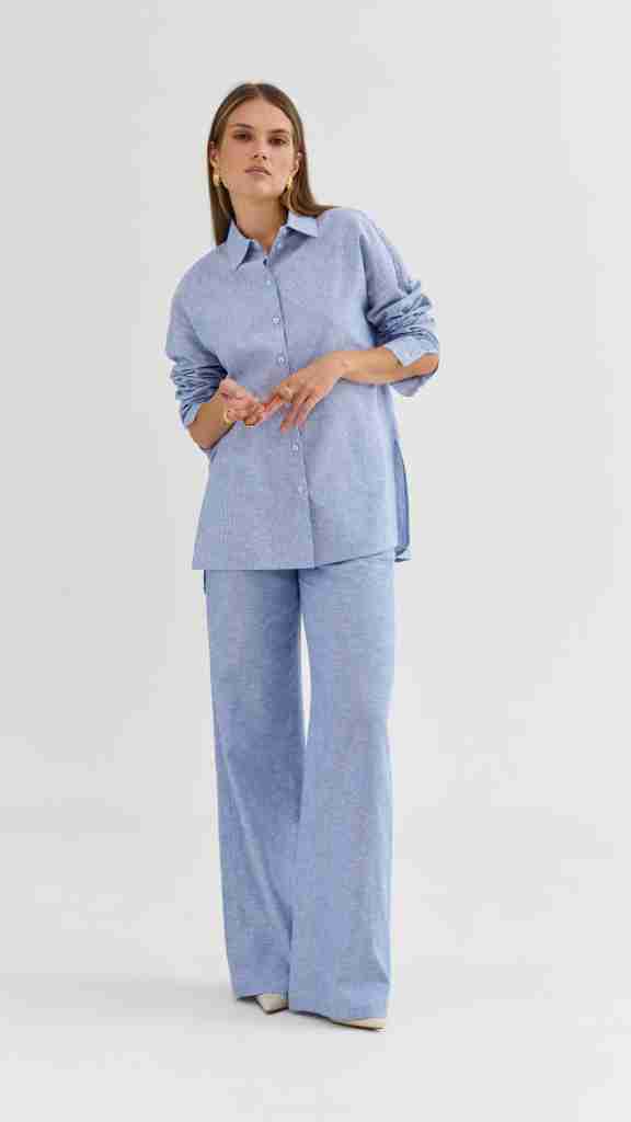 Elegantní baby blue kalhoty s širokými nohavicemi jsou ideální volbou pro moderní, minimalistický styl. Rovný, volný střih vytváří krásně dlouhou linii a opticky prodlužuje nohy, takže působí velmi žensky a sofistikovaně. Skvěle se hodí jak do práce, tak i na večerní setkání nebo stylovou procházku městem.