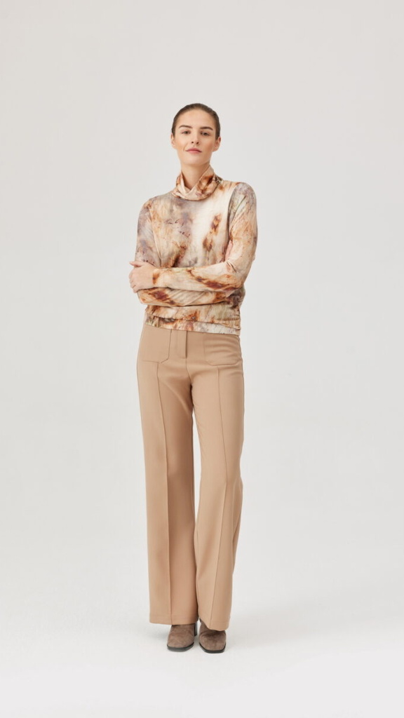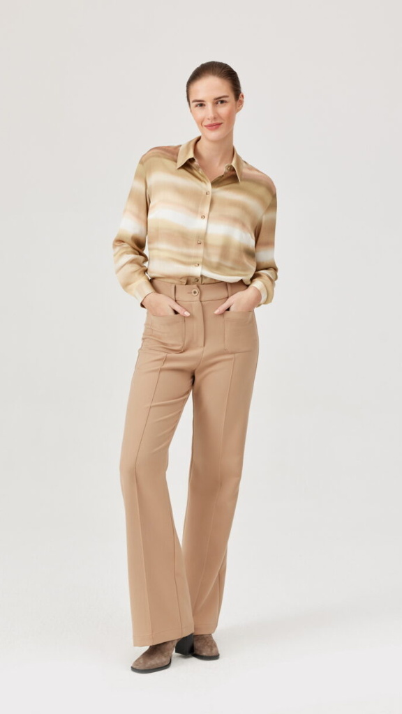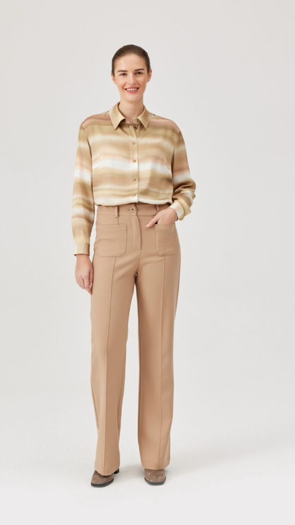 Elegantní kalhoty klasického střihu s rovnými nohavicemi a vysokým pasem. Jsou ušité z hladké, lehce pružné látky, která krásně splývá a zajišťuje pohodlí při nošení. Přední nakládané kapsy dodávají moderní nádech, zatímco podélný záhyb na nohavicích opticky prodlužuje nohy a působí upraveným dojmem.