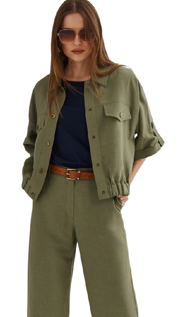 Elegantní sako / blejzr s příměsí lnu, které spojuje stylový vzhled s maximálním komfortem nošení. Díky zapínání na druky působí čistě, moderně a velmi prakticky. Lněná příměs zajišťuje lehkost, prodyšnost a příjemný pocit i během teplejších dnů.