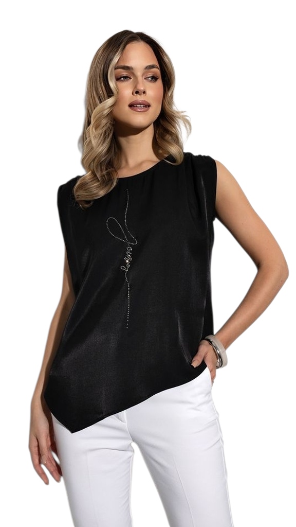 Asymetrický střih dodává halence moderní a lehce extravagantní vzhled, který opticky prodlužuje siluetu a působí velmi žensky. Decentní zdobení na přední části přidává jemný elegantní detail, aniž by narušilo čistý design.