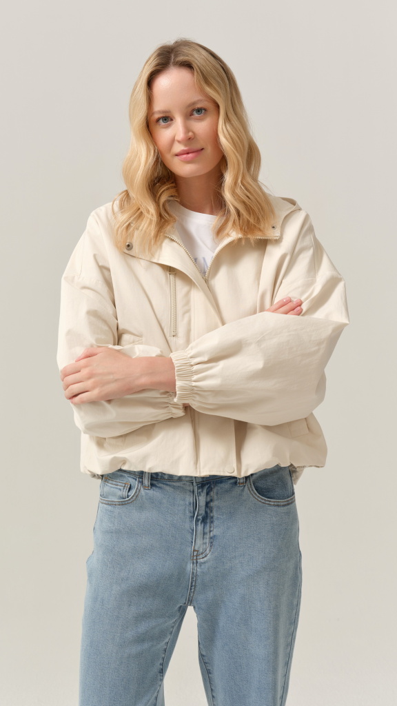 Bunda působí vzdušně, ale zároveň drží tvar. Zadní díl je čistý, jemně projmutý s decentním členěním, které podtrhuje moderní vzhled. Díky neutrální barvě ji snadno sladíte s denimem, bílou, béžovou i pastelovými tóny.