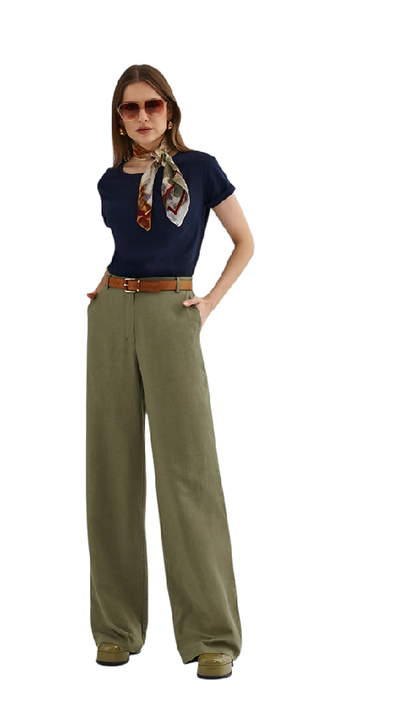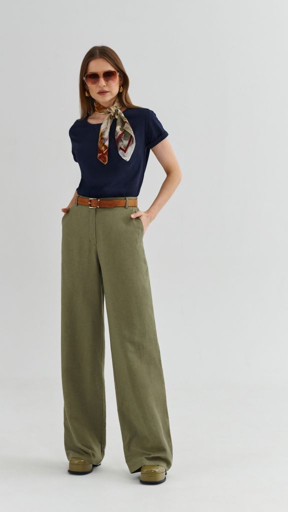 Vysoký pas s poutky na pásek krásně prodlužuje siluetu, rovné široké nohavice působí velmi žensky a vzdušně.Zadní díl je v pase do gumy. Kalhoty se skvěle kombinují jak s jednoduchým trikem, tak s blejzrem do dokonale sladěného kostýmu.
