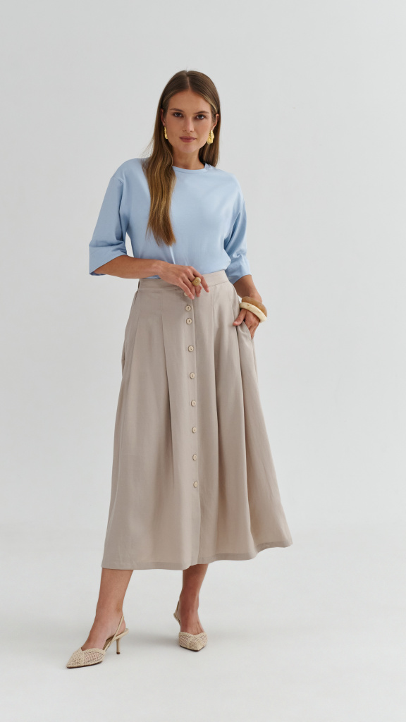 Stylová béžová sukně EZURI v midi délce s rozšířeným střihem, která krásně pracuje v pohybu a vytváří ženskou siluetu.