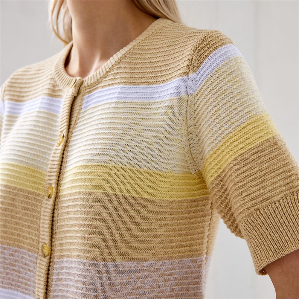 Elegantní pletený kardigan MICHA zaujme svým jemným pruhovaným designem v pastelových tónech, které působí svěže, ženskě a velmi letně.