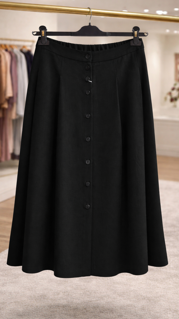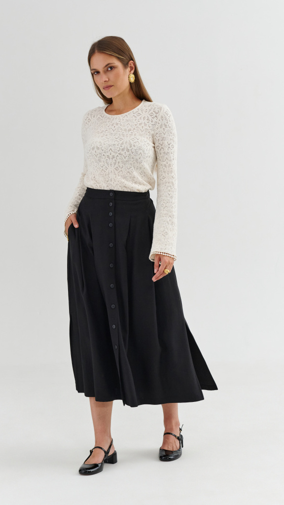 Stylová černá sukně EZURI v midi délce s rozšířeným střihem, která krásně pracuje v pohybu a vytváří ženskou siluetu.