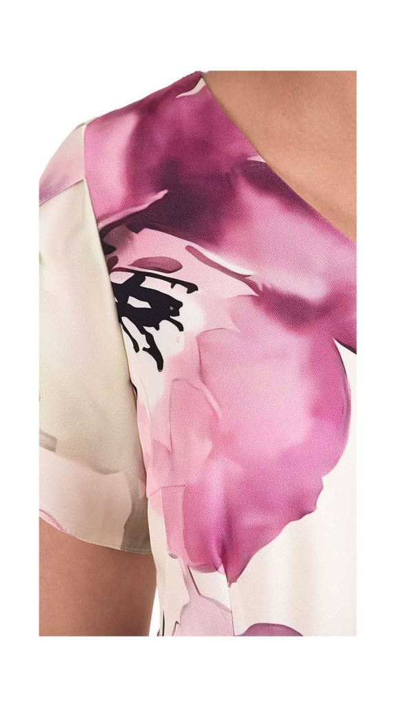 Horní část s výstřihem do V krásně zvýrazní dekolt a je doplněná decentní aplikací, která dodává modelu luxusní nádech. Krátké, lehce splývavé rukávy působí vzdušně a zajišťují pohodlí i v teplejších dnech.