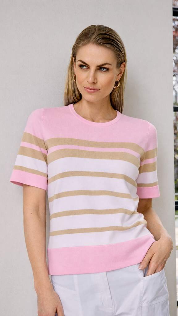 Svetr má kulatý výstřih a krátký rukáv, díky čemuž je ideální volbou pro jarní a letní období. Jemná pletenina je příjemná na dotek a dobře drží tvar. Spodní lem i rukávy jsou zakončeny pružným nápletem, který zajišťuje pohodlné nošení.