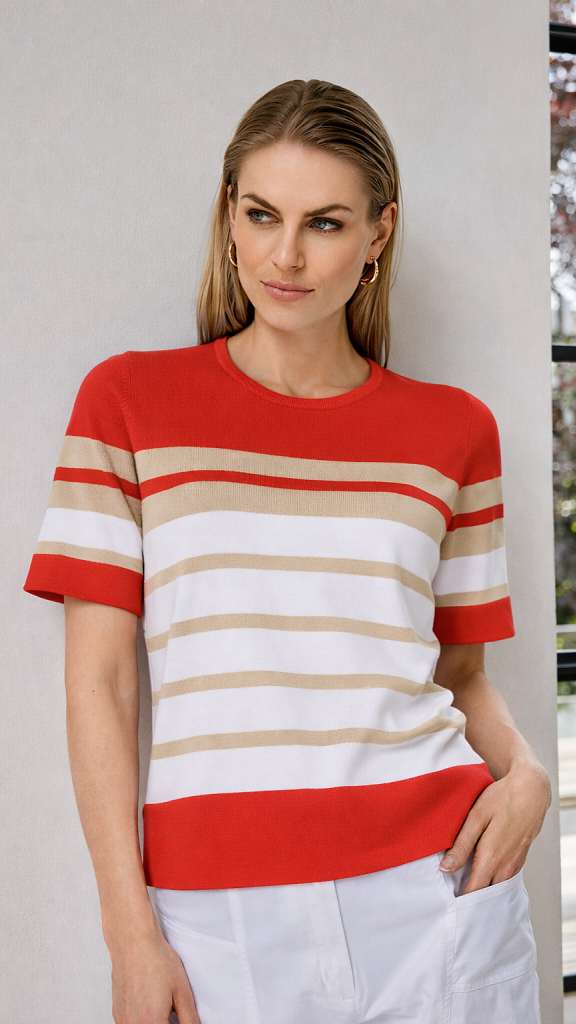 Svetr má kulatý výstřih a krátký rukáv, díky čemuž je ideální volbou pro jarní a letní období. Jemná pletenina je příjemná na dotek a dobře drží tvar. Spodní lem i rukávy jsou zakončeny pružným nápletem, který zajišťuje pohodlné nošení.