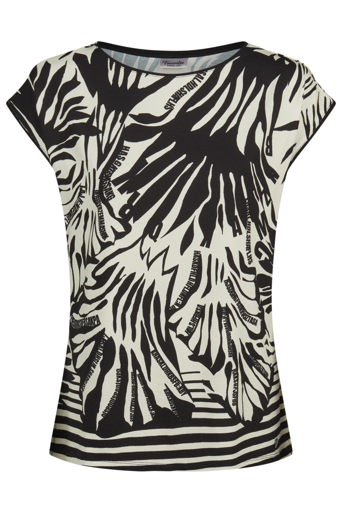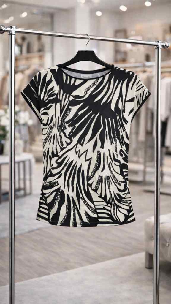 Stylové dámské triko s výrazným černo-krémovým potiskem v moderním grafickém stylu. Dynamický vzor dodává modelu energii a originalitu, přitom zůstává velmi elegantní a snadno kombinovatelný.