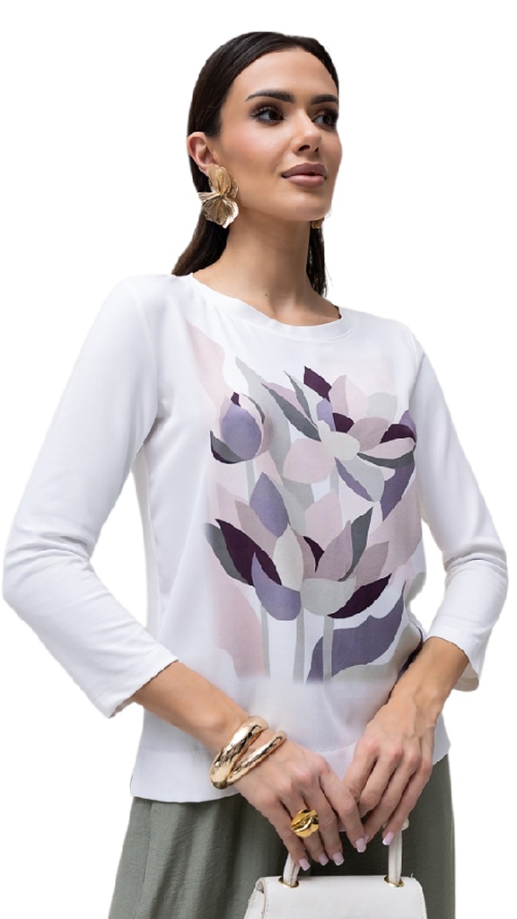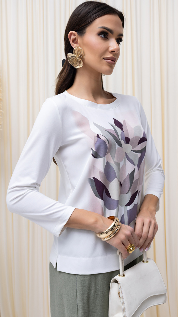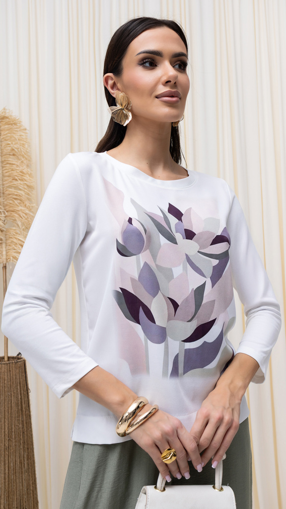 Elegantní halenka AVVA s jemným květinovým potiskem v tlumených pastelových tónech, která působí velmi žensky a nadčasově. Přední díl zdobí decentní motiv květů v kombinaci pudrové, šedé a jemně fialové barvy na čistě bílém podkladu.