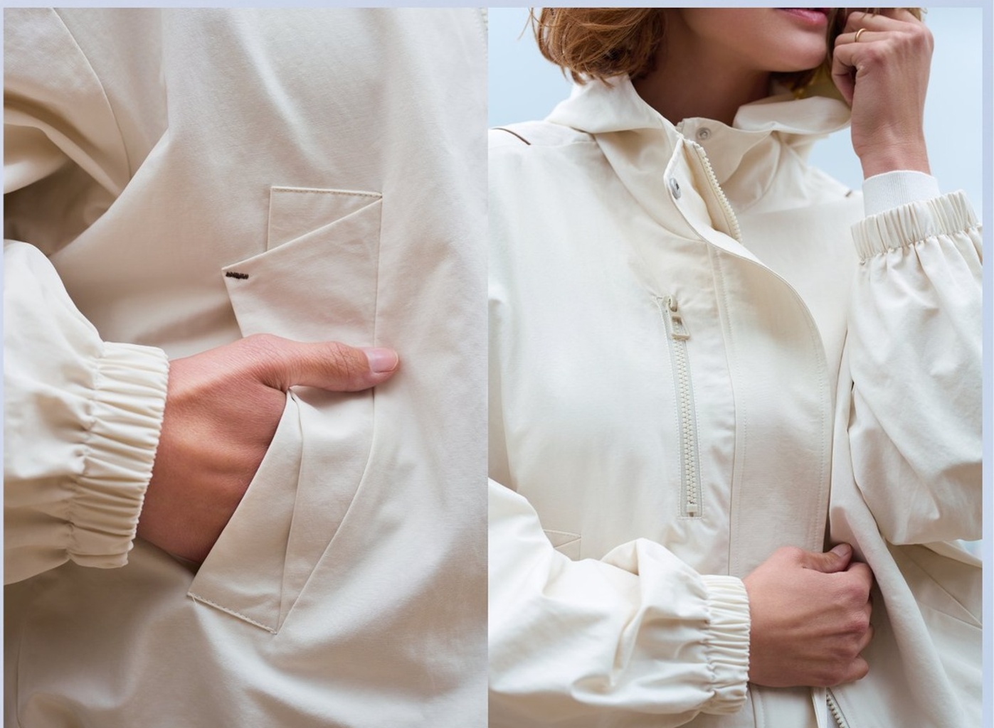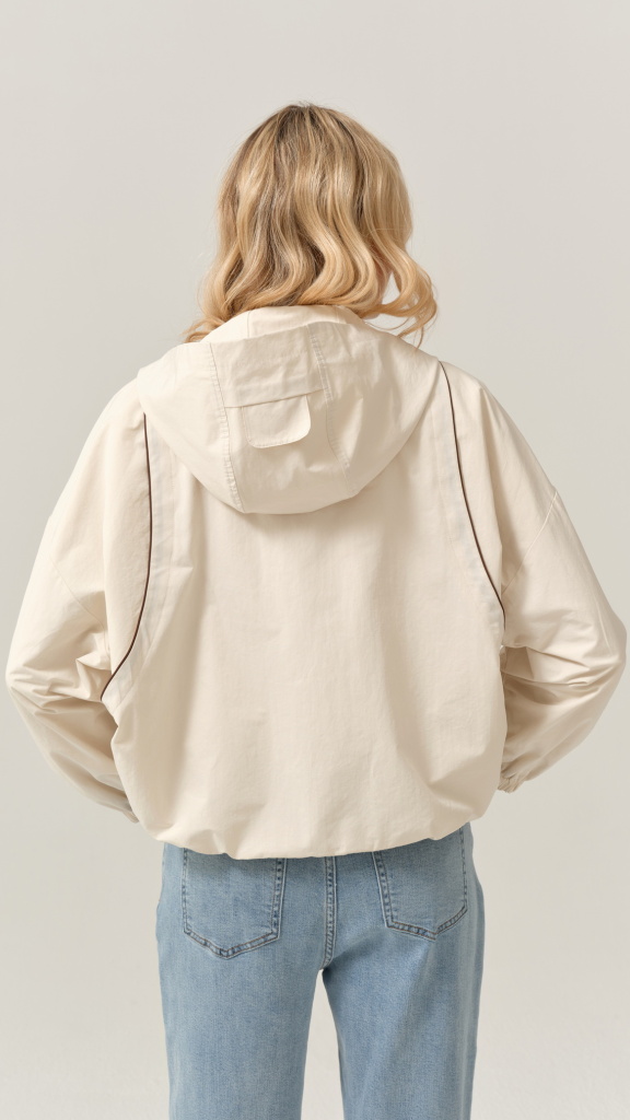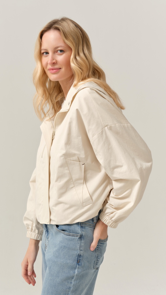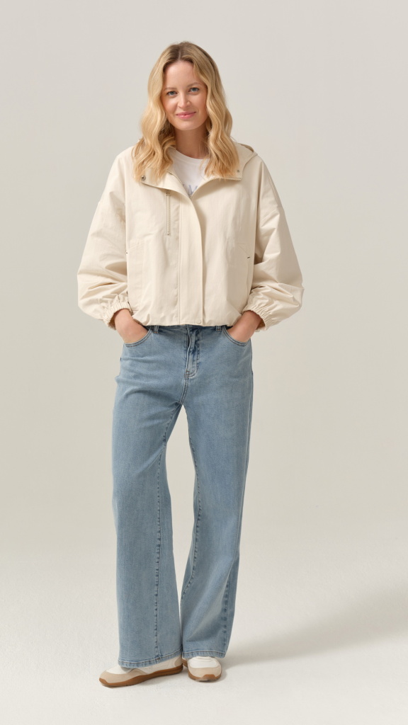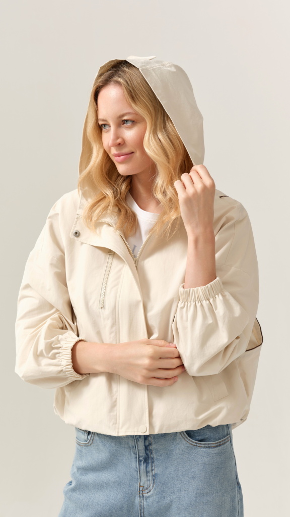 Bunda působí vzdušně, ale zároveň drží tvar. Zadní díl je čistý, jemně projmutý s decentním členěním, které podtrhuje moderní vzhled. Díky neutrální barvě ji snadno sladíte s denimem, bílou, béžovou i pastelovými tóny.