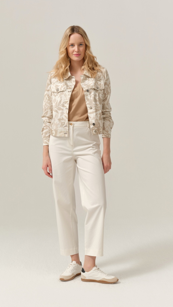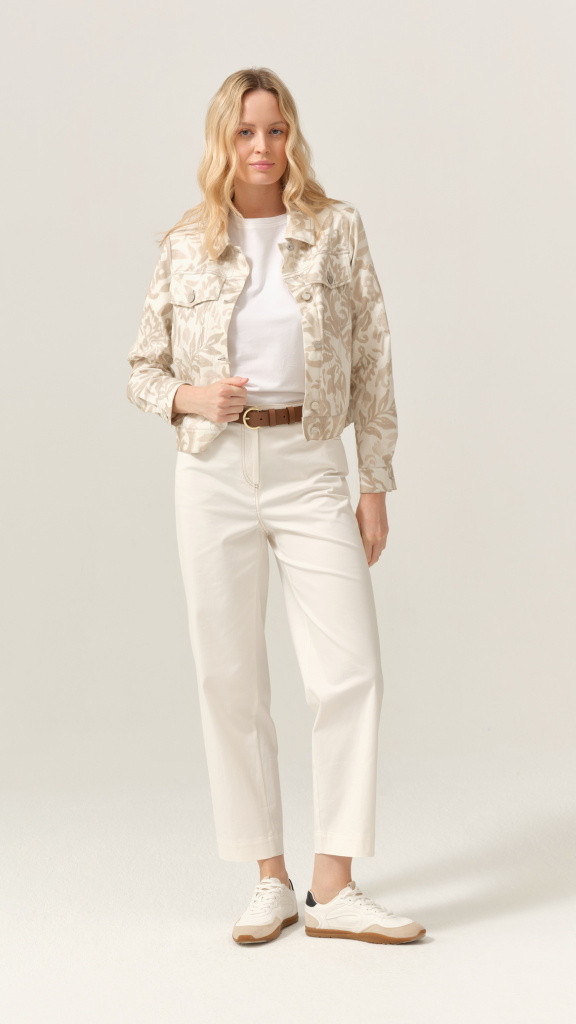 Krátký, lehce boxy střih do pasu krásně zvýrazní siluetu a perfektně ladí s kalhotami i sukněmi s vyšším pasem. Jemný tón v přírodních béžových odstínech doplňuje výrazný, ale stále elegantní vzor, který dodává modelu originalitu a šmrnc.