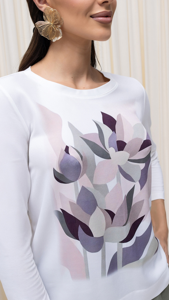 Elegantní halenka AVVA s jemným květinovým potiskem v tlumených pastelových tónech, která působí velmi žensky a nadčasově. Přední díl zdobí decentní motiv květů v kombinaci pudrové, šedé a jemně fialové barvy na čistě bílém podkladu.