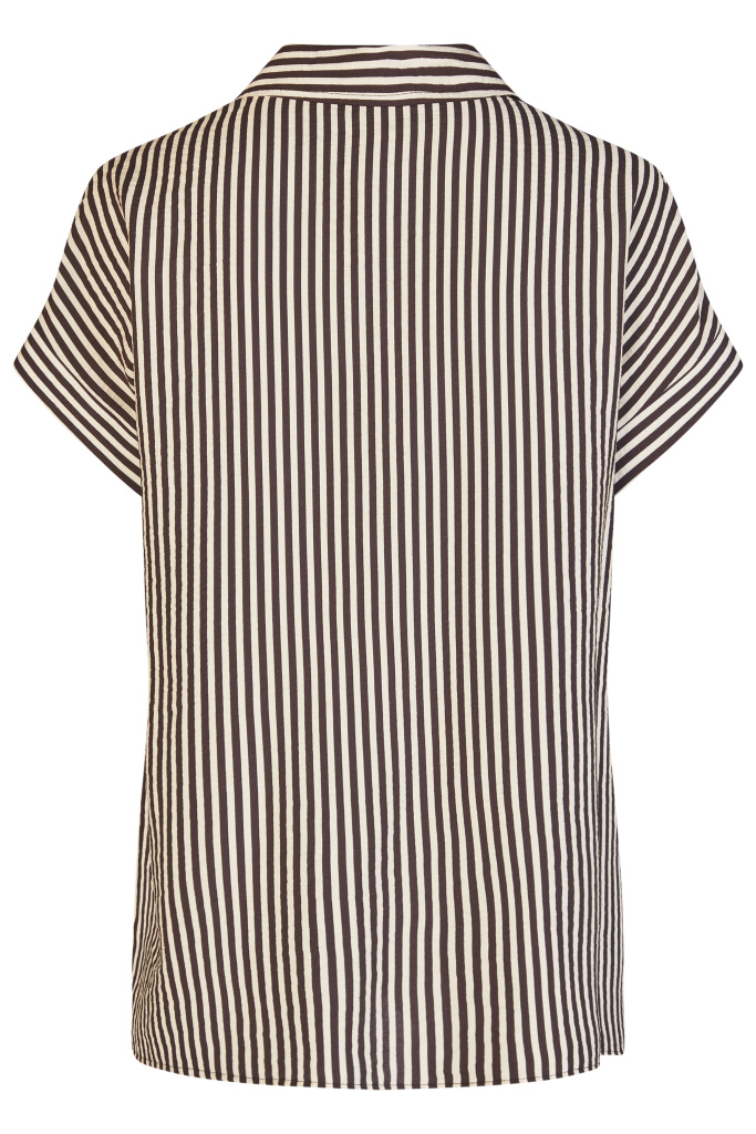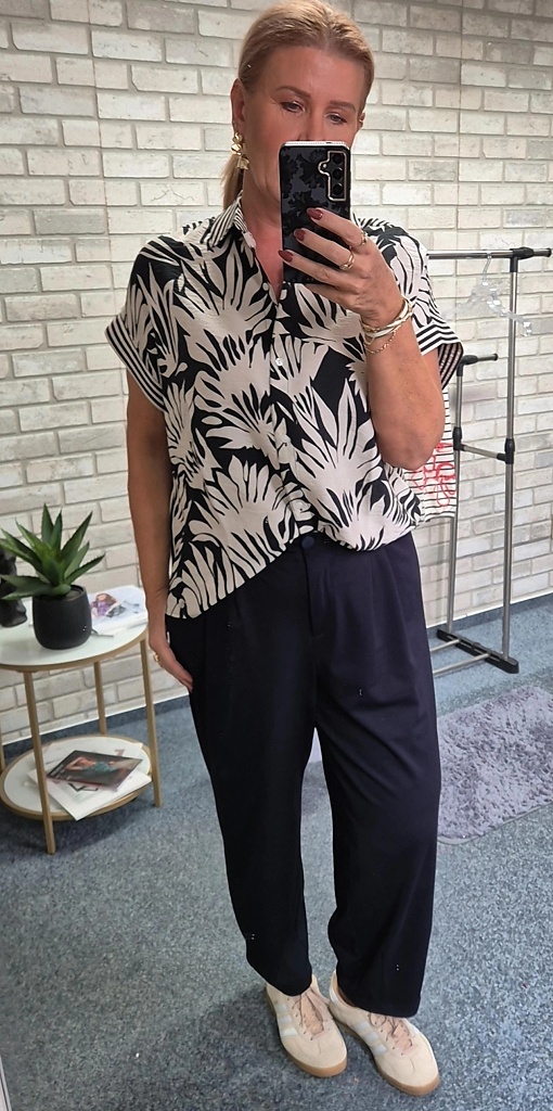 Košile má volnější oversize střih, který krásně splývá, je pohodlný na nošení a lichotí postavě. Krátké rukávy s ohrnutím a klasický límeček působí elegantně, zapínání na knoflíčky umožňuje nosit košili jak formálně, tak i ležérně rozepnutou.