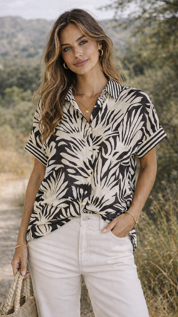 Stylová oversize košile, která zaujme originální kombinací vzorů a nadčasovou černo-smetanovou barevností. Přední díl zdobí výrazný rostlinný motiv, zatímco zadní strana a vnitřní detaily jsou řešeny jemným proužkem, který celému modelu dodává moderní kontrast a lehkost.