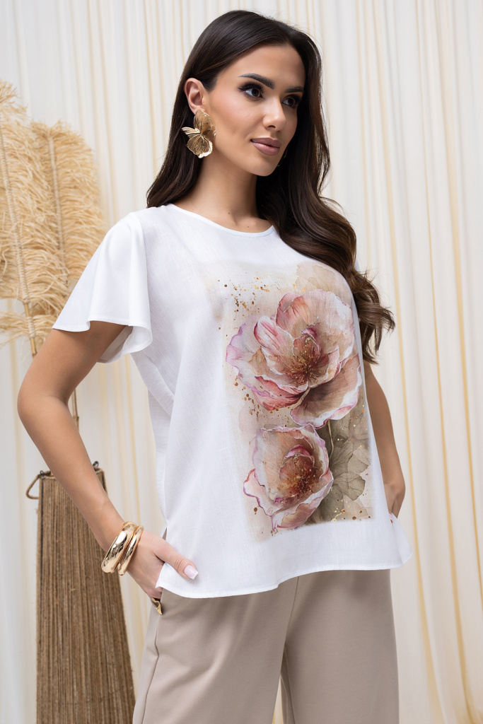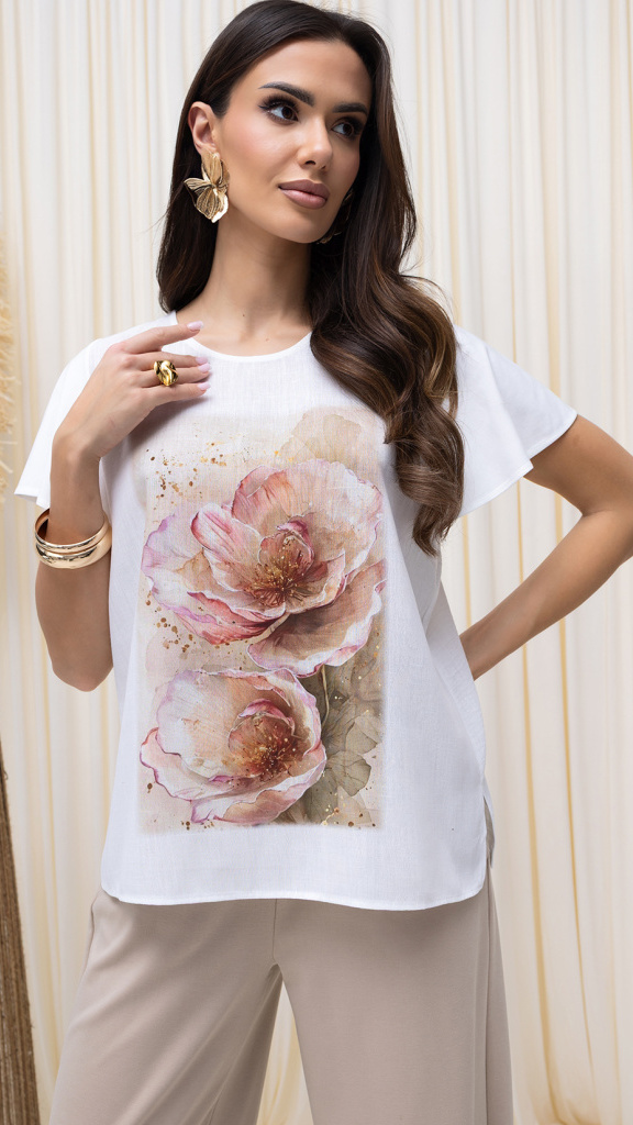 Halenka má volnější, splývavý střih, který lichotí postavě a je maximálně pohodlný na nošení. Krátké, jemně rozšířené rukávy působí vzdušně a zakryjí horní část paží, což ocení mnoho žen. Materiál je lehký, prodyšný a ideální na jarní a letní období.