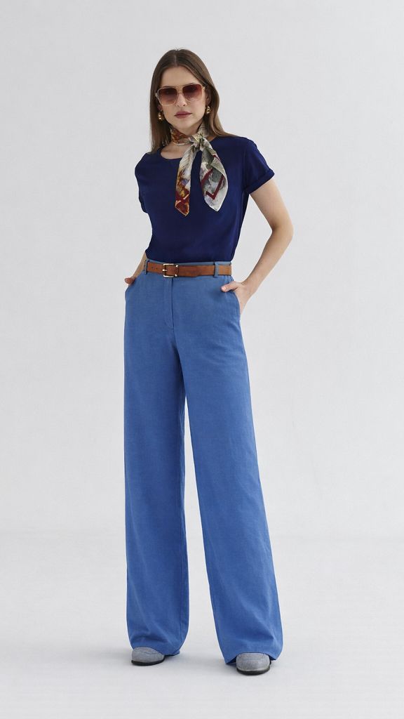 Vysoký pas s poutky na pásek krásně prodlužuje siluetu, rovné široké nohavice působí velmi žensky a vzdušně.Zadní díl je v pase do gumy. Kalhoty se skvěle kombinují jak s jednoduchým trikem, tak s blejzrem do dokonale sladěného kostýmu.