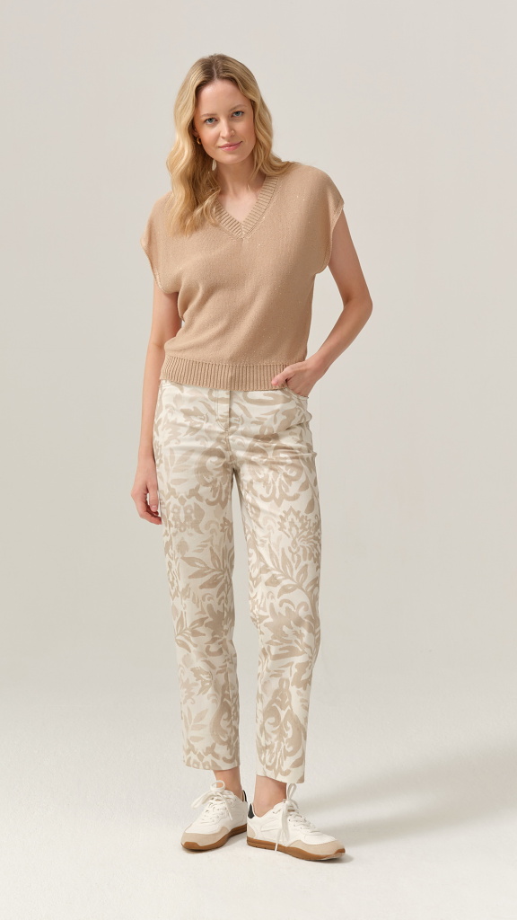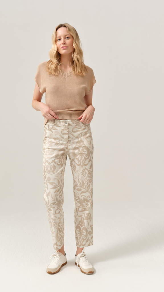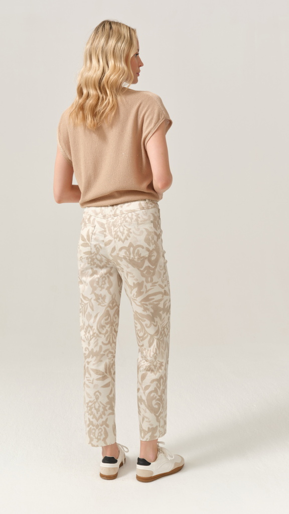 Kalhoty FERIA zaujmou na první pohled svým originálním tón v tónu vzorem v přírodních béžových odstínech, který působí velmi sofistikovaně a nadčasově. Díky tomu je snadno zkombinujete nejen jako komplet s bundičkou, ale i samostatně s jednoduchými topy či úplety.