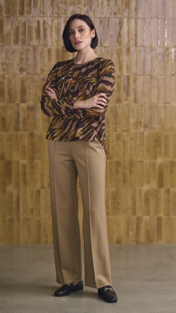 Ležérní a formální kalhoty FERIA se širokou nohavicí. Vyrobeno z pevného hustého úpletu velbloudí barvy. Přední část nohy je zdobena vertikálním lemem, který zdůrazňuje elegantní charakter kalhot. Kapsy v bočních švech. V pase guma pro snadné přizpůsobení postavě. K dispozici také v černé barvě.