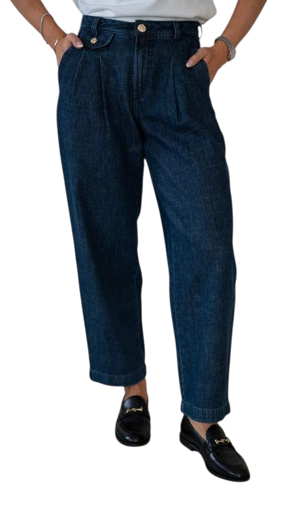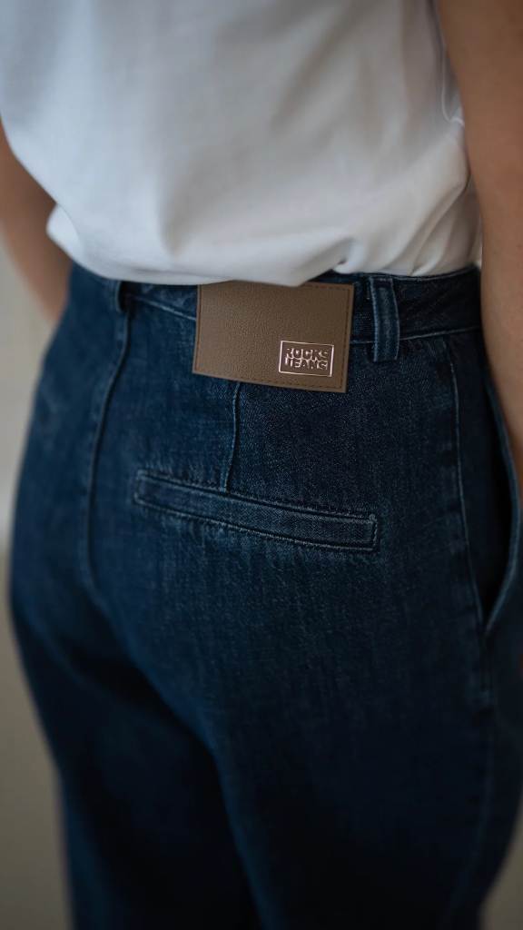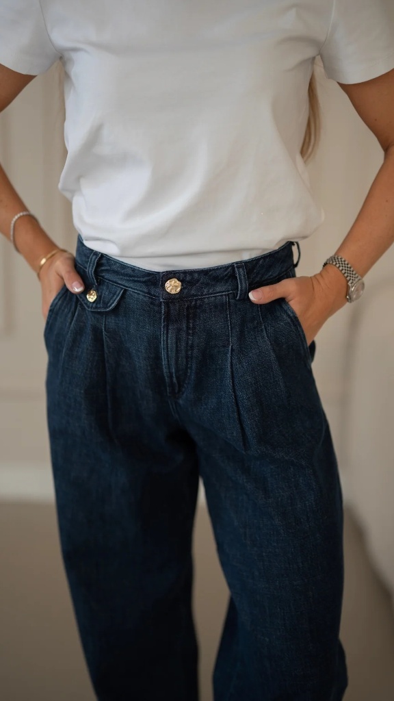 Na předním díle jsou záševky, které krásně tvarují látku a zvýrazňují pas. Tvarované stříbrné knoflíky spolu s tmavě modrou povrchovou úpravou dodávají džínům elegantní a sofistikovaný vzhled.