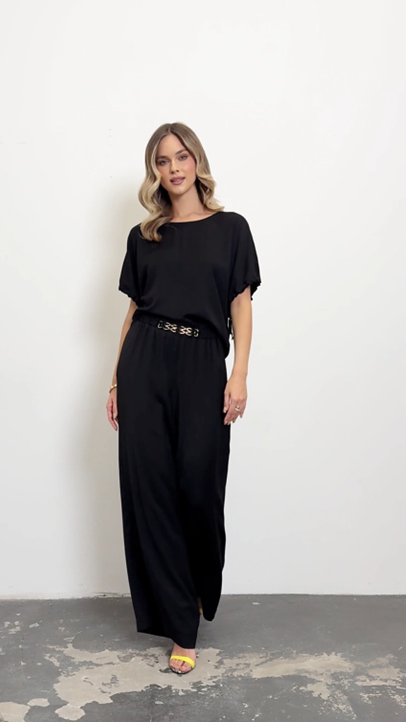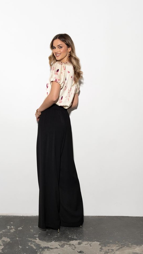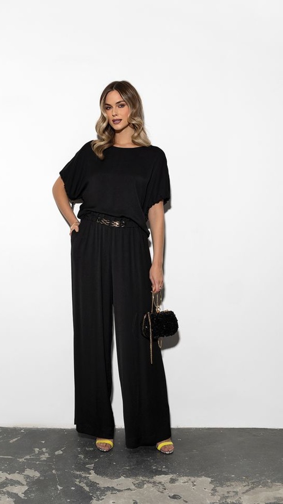 Kalhoty mají volný, lehce rozšířený střih, který opticky prodlužuje nohy a působí velmi žensky. Materiál je jemný, splývavý a příjemný na nošení. V kombinaci s halenkou DIXI ze stejné kolekce tvoří dokonale sladěný komplet ve stylu moderního overalu – ideální pro společenské příležitosti, pracovní schůzky i elegantní večerní outfit.