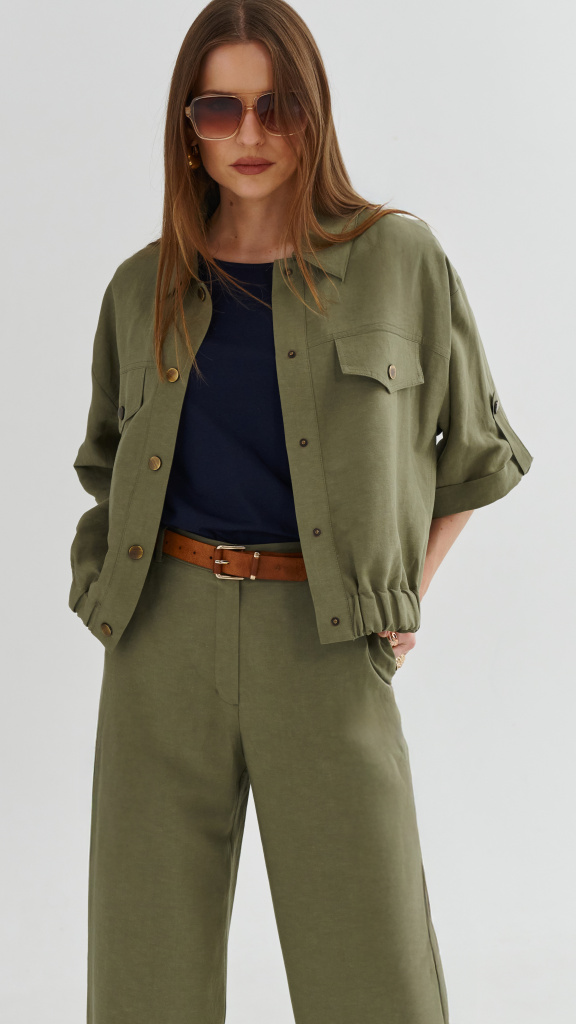 Elegantní kratší bundička s příměsí lnu, které spojuje stylový vzhled s maximálním komfortem nošení. Lněná příměs zajišťuje lehkost, prodyšnost a příjemný pocit i během teplejších dnů.
