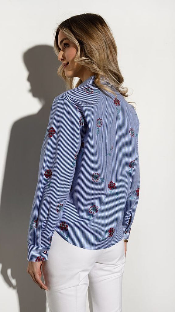 Elegantní košile FABIANA v jemném modrobílém proužku zaujme na první pohled hravým, ale stále kultivovaným vzhledem. Decentní květinová výšivka dodává modelu ženskost a originalitu, zatímco klasický košilový střih zajišťuje nadčasovou nositelnost – ideální do práce i pro volný čas.