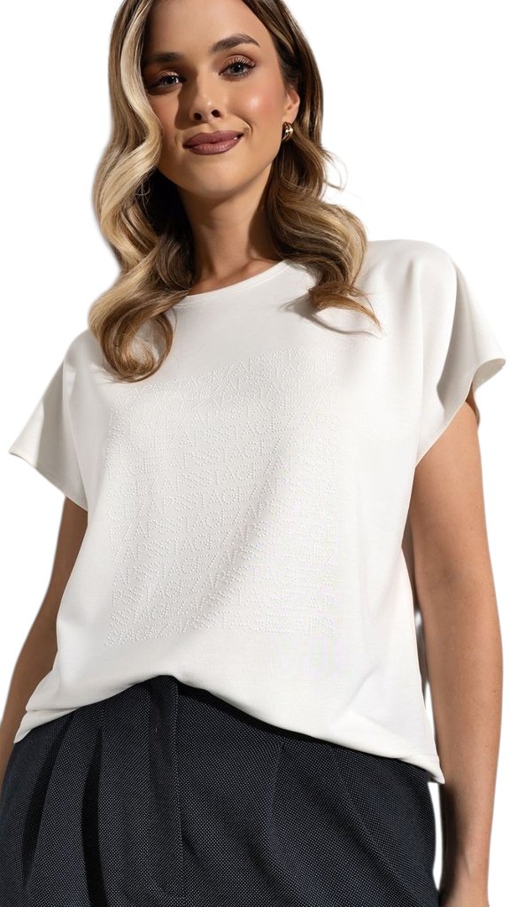 Přední díl zdobí decentní aplikace z drobných kamínků, která vytváří elegantní efekt a dodává modelu jemný lesk bez zbytečné okázalosti. Volnější střih s krátkým rukávem lichotí siluetě a umožňuje snadné kombinování – skvěle se hodí ke kalhotám, sukním i pod sako či kardigan.