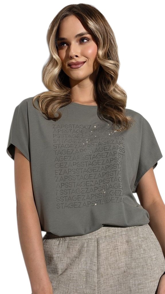 Přední díl zdobí decentní aplikace z drobných kamínků, která vytváří elegantní efekt a dodává modelu jemný lesk bez zbytečné okázalosti. Volnější střih s krátkým rukávem lichotí siluetě a umožňuje snadné kombinování – skvěle se hodí ke kalhotám, sukním i pod sako či kardigan.