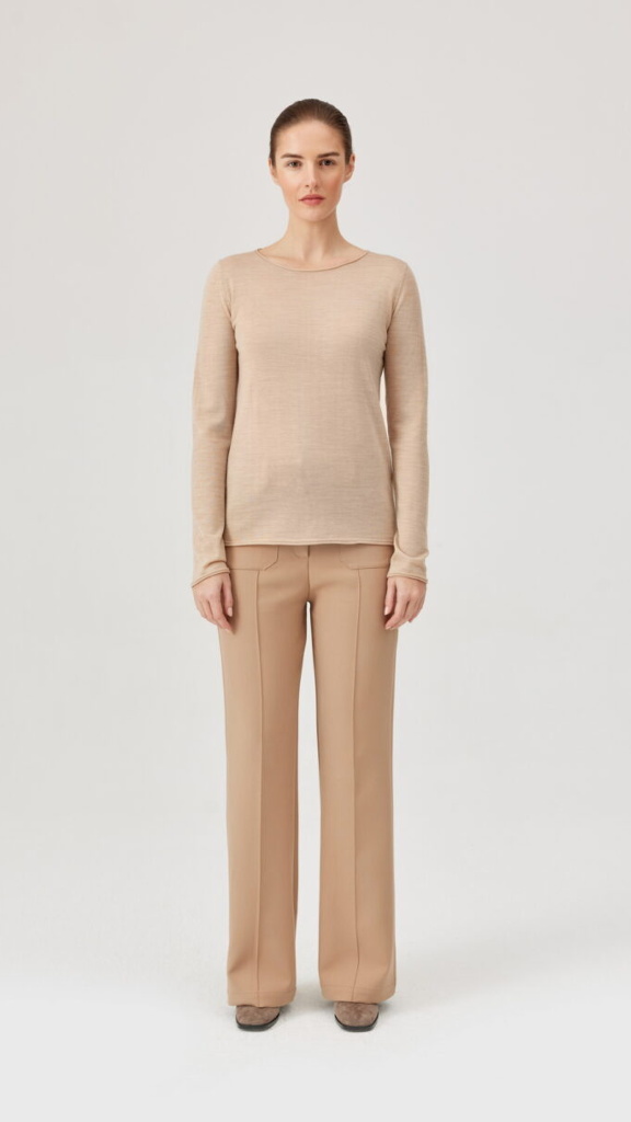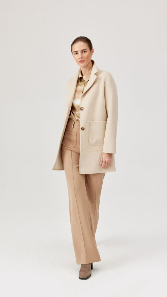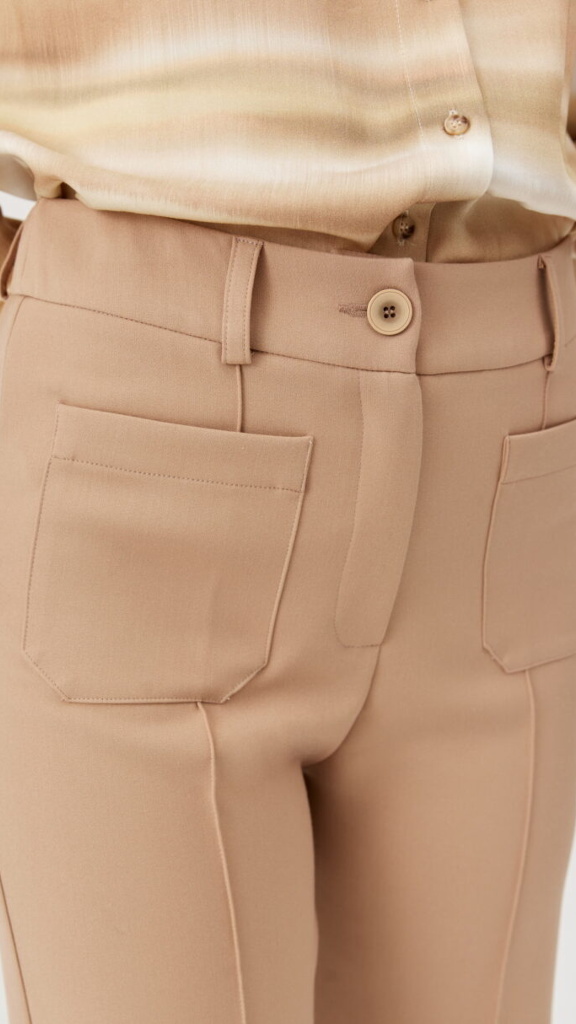 Elegantní kalhoty klasického střihu s rovnými nohavicemi a vysokým pasem. Jsou ušité z hladké, lehce pružné látky, která krásně splývá a zajišťuje pohodlí při nošení. Přední nakládané kapsy dodávají moderní nádech, zatímco podélný záhyb na nohavicích opticky prodlužuje nohy a působí upraveným dojmem.