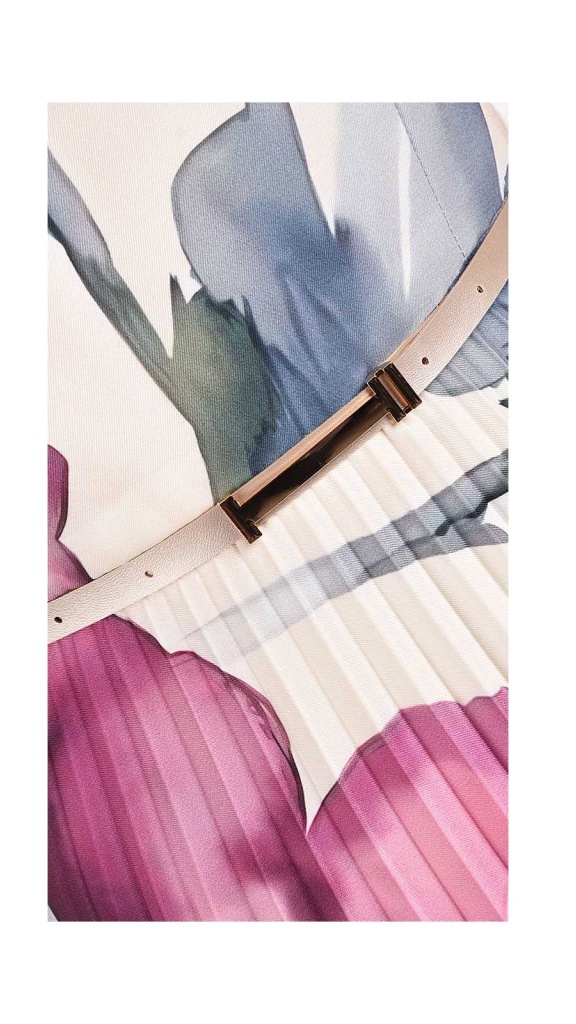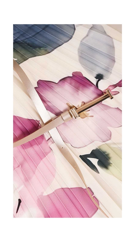 Ideální volba na společenské události, oslavy i elegantní denní nošení. Součástí tenký opasek v pudrovém odstínu.