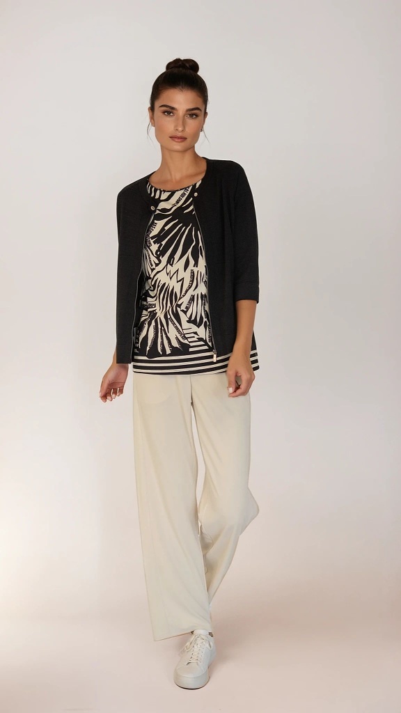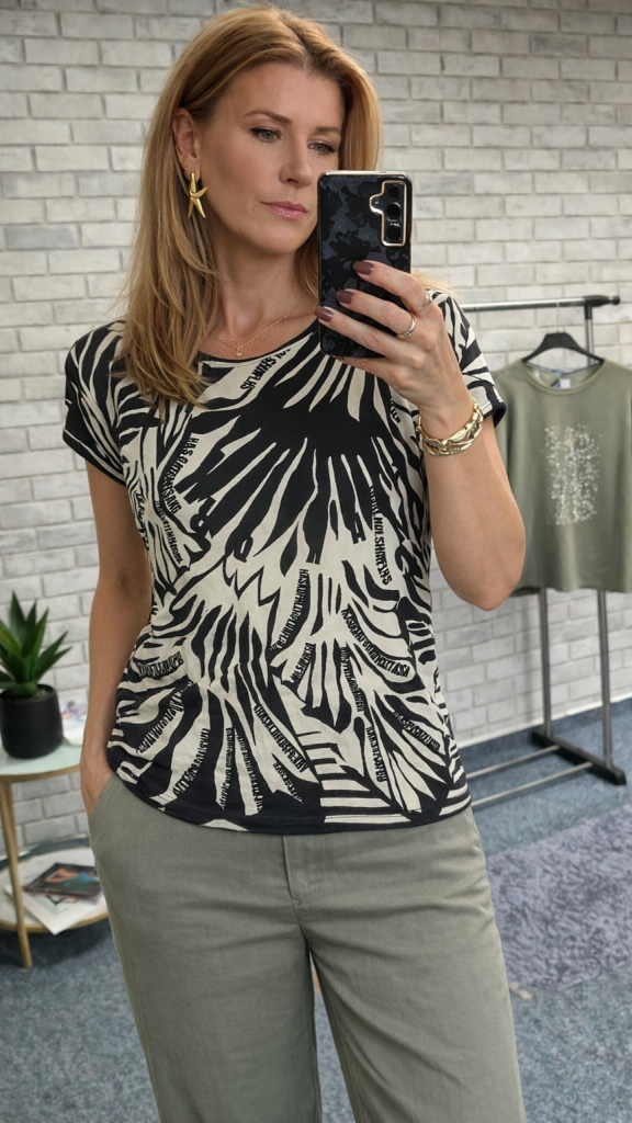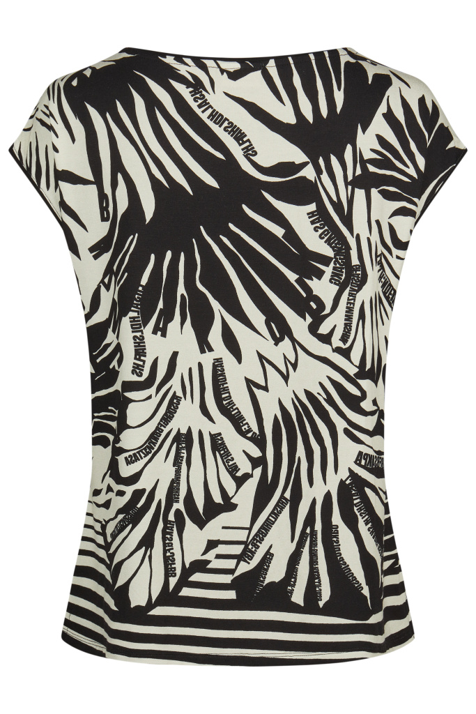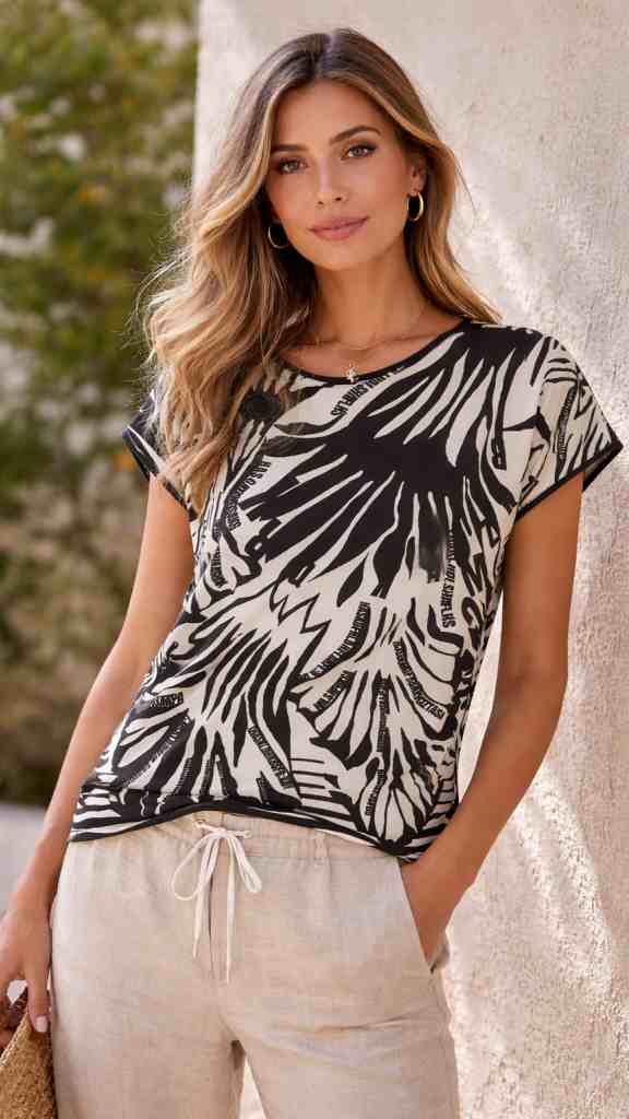 Stylové dámské triko s výrazným černo-krémovým potiskem v moderním grafickém stylu. Dynamický vzor dodává modelu energii a originalitu, přitom zůstává velmi elegantní a snadno kombinovatelný.