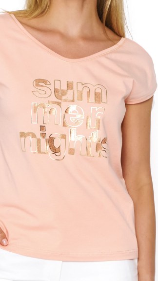 Jemně lososové triko s kulatým výstřihem a zlatým nápisem na přední straně.V výstřih a konce rukávků lemované zlatou nití, která dodává triku patřičný šmrnc Toto tričko bez rukávů je univerzálním základem pro teplé dny.